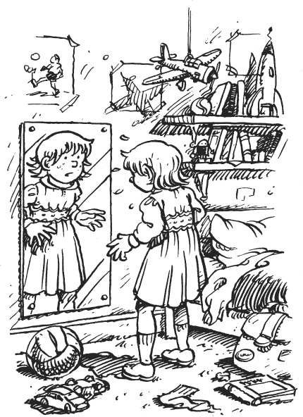 And she swept out, leaving him staring in dismay at the mirror. In it, a girl with his curly red hair and wearing a pretty pink frock with fiddly shell buttons was staring back at him in equal dismay.