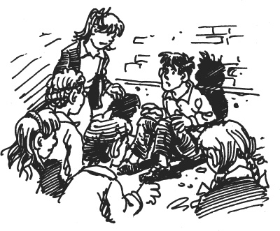 He stared round the playground. In one corner, two of the bigger boys were putting their arms round a sobbing toddler who’d lost his pet marble, or something. By the porch, boys and girls were practising a hornpipe. (I am serious.) Next to the gates, a gaggle of merrymakers were doing a complicated clapping game. And all the rest were ambling around, smiling and waving to one another, or loyally waiting for friends outside the lavatories.
