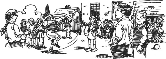 No kidding. They were skipping. Two rosy-cheeked milkmaids in pigtails were swinging this great long rope, and everyone else was jumping up and down, all thrilled to bits, waiting their turn.