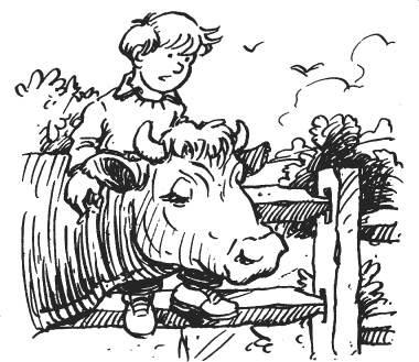Lance was thrilled. He went back day after day, to watch Flossie grow. He carried water and shovelled cow-cake for all the cattle on the farm, but Flossie was his favourite. He talked to her while she sniffed curiously at his pockets and butted him with her head to try and make him play, and followed him round the field. He told her everything, and kept on telling as the months went by, and Flossie grew and grew, till finally she was vast, enormous, bigger than Lance, almost as big as a car, with huge brown, anxious, motherly eyes.
