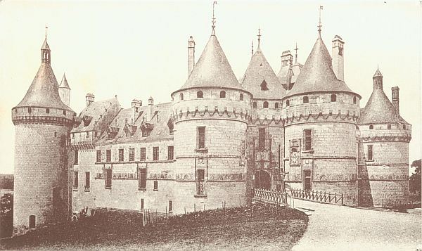Leaving the auto in the village, we climbed up to the castle by a steep and narrow path and entered the great doorway where the moat and drawbridge between the huge round towers again reminded us of Langeais. Over this entrance are the graven initials of Louis and Anne of Brittany, the arms of George of Amboise with his cardinal's hat, and the double C's of Charles of Chaumont and his wife, Catherine of Chauvigny. Here also are some scattered D's which stand for Diane of Poitiers, who consented to accept this château when Catherine offered her a Hobson's choice of Chaumont or nothing. We were especially interested in a rich frieze in which were intertwined the double C's and the odd device of the burning mountain, "Chaud-mont," from which, it is said, the name of the château was derived. As Chaumont is still inhabited, we were not shown the whole of the castle, but fortunately for us the suite of historic rooms was on view. Here again we came upon associations with the dreadful Catherine, whose bedroom and furniture are shown to visitors. Whether or not these articles are genuine, and grave doubts are thrown upon their authenticity, they are very handsome and of the proper period. The tapestries in these rooms are all old and charming in color, of old rose and pink. A description which I came across in a delightful book by Mr. Theodore A. Cook, which M. La Tour brought us from his mother's library, gives a better idea of this tapestry than any words of mine: "Beside the door a blinded Love with rose-red wings and quiver walks on the flushing paths, surrounded by strange scrolls and mutilated fragments of old verses; upon the wall in front are ladies with their squires attending, clad all in pink and playing mandolins, while by the stream that courses through the flowery meadows small rosy children feed the water birds, that seem to blush with pleasure beneath the willow boughs of faded red."