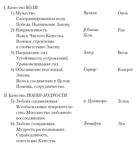 Каждое Качество, будучи неким определенным током, может быть воспринято нами в процессе медитации с помощью слов-призывов, которые даны в скобках для каждого знака и являются звукосочетаниями, служащими своего рода материальными представителями Мастеров (далее об этом будет подробно рассказано).