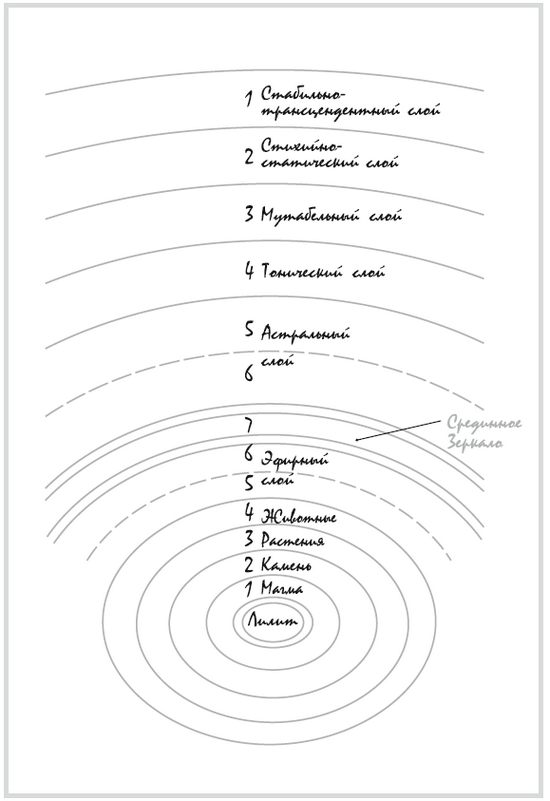 ВТОРОЙ МАСТЕР входит вслед за Первым и выделяет более плотный материал, образуя второй слой – СТИХИЙНО-СТАТИЧЕСКИЙ. Отражаясь в Срединном Зеркале, он проявляется в нижней части в качестве слоя КАМНЯ. Затем вступает в дело ТРЕТИЙ МАСТЕР и выделяет МУТАБЕЛЬНЫЙ слой, который отражается внизу в виде мира РАСТЕНИЙ. ЧЕТВЕРТЫЙ МАСТЕР создает ТОНИЧЕСКИЙ слой, отражающийся как мир ЖИВОТНЫХ. ПЯТЫЙ МАСТЕР дает пятый слой, пока не структурированный достаточно, чтобы его можно было назвать или подробно описать: он не достроен до конца, не разделен, не ограничен. Отражение его также находится в процессе коагуляции. То же можно сказать и о деятельности ШЕСТОГО МАСТЕРА. Пока мы ограничимся шестью Мастерами, хотя у Алес их должно быть двенадцать (рис. 6).