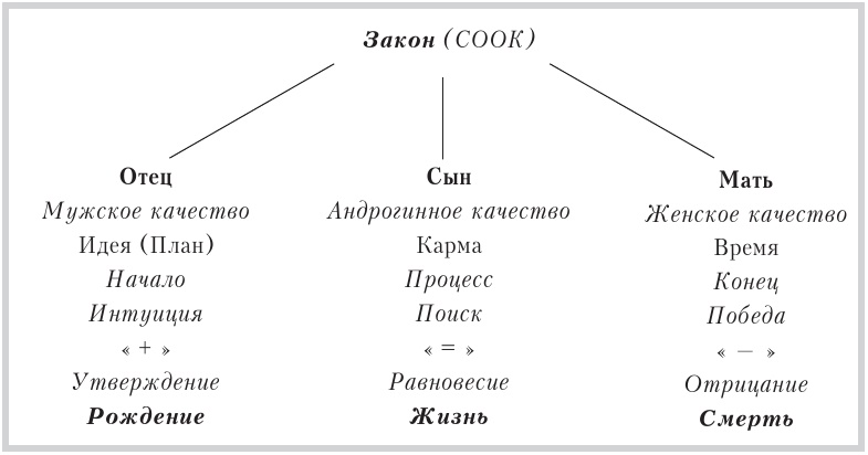 Итак, мы выделили два аспекта Космического Закона, определив их как План, или Идею, и Карму. Кроме того, по закону троичности, где каждый Аспект Целого (а таковым является Закон) несет в себе один из Принципов Троицы, существует еще и такой его аспект, как Время, которого мы здесь подробно не будем касаться, так как он не является основной темой этой работы. Приводимая ниже таблица поможет вам составить себе более или менее адекватное представление о троичности Космического Закона (таблица 1).