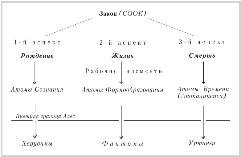 Стабильно-трансцендентный и Стихийно-статический слоиПри вхождении в Стабильно-трансцендентный слой Алес Закон представляет собой триединый конгломерат аспектов*: Отца – рождения, Матери – смерти и Сына – жизни, выделяющих соответствующие рабочие элементы: Атомы Сознания, Времени и Формообразования. Аспект Формообразования наиболее интересен в контексте этой книги, так как непосредственно касается каждого из нас в виде человеческой кармы.