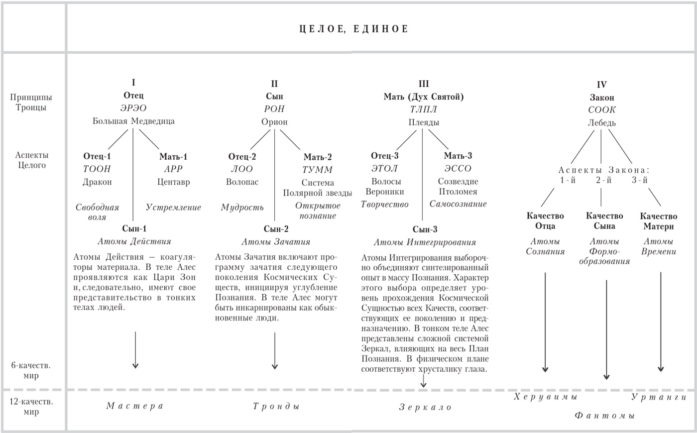 На этой схеме выявлены рабочие элементы каждого аспекта. Через принцип Сознания (аспект Отца) происходит движение Закона в более густой материал, «вниз». На этом этапе поток рабочих энергий коагулируется в отдельные Космические Сущности, условно обозначенные в настоящей работе как Атомы, сохраняющие все качества своего Первоисточника, в том числе способность всепроникновения и самоопределения. В данном случае, эти Сущности, или Атомы Сознания, проникая в тело 12-качественной Космической Сущности типа Земли-Алес, имеют тело – нейтрино и дух – Херувимов69.