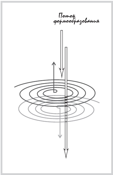 Специфика Стихийно-статического слоя такова, что все, что в нем созидается, принимает формы разнонаправленных турбулентов. Этому способствуют возникшие в этом материале новые формы 2-го аспекта Закона (Жизнь), получившие название Великих Стихий28. Взаимодействуя, они создают спиралевидные вихри. Образование Стихий вихревой формы происходит под напором энергий формообразования, оказывающих давление на соответствующий материал. Способность оказывать такого рода воздействие для наглядности можно уподобить некоторым физическим свойствам текучих материалов. Например, вода из крана при небольшом напоре течет свободной струей. Но стоит увеличить давление снаружи (в трубе), и образуется турбулент, рождаемый сопротивлением материала. Вихревые явления наблюдаются и в атмосфере, когда находящиеся в покое воздушные массы приходят в движение при изменении давления (циклоны и антициклоны). Давление потока Атомов Формообразования на инертный, уплотненный Мастерами материал Стихийно-статического слоя заставляет этот материал оказывать направленное сопротивление, приводящее его в вихревое движение. При пронизывании турбулента Стихий потоком Атомов Формообразования материал увлекается в направлении потока, образуя противоположное направление «вниз». Турбулент Стихий становится двунаправленным (рис. 2).