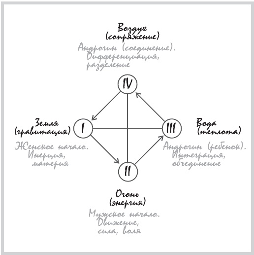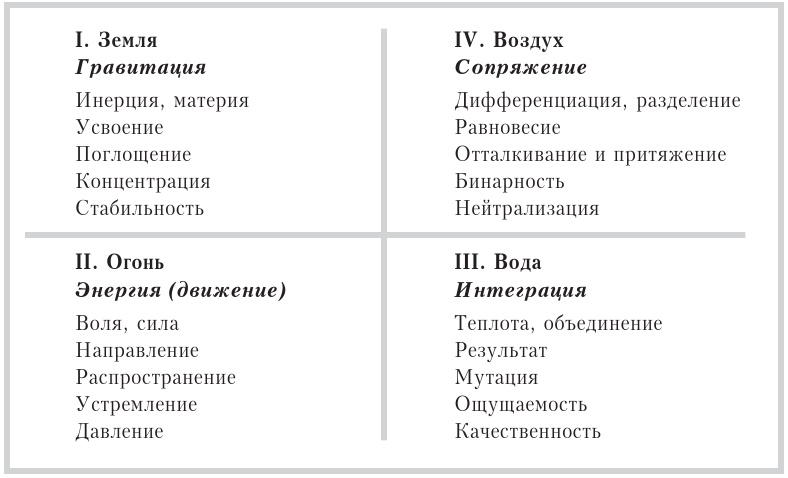 Получив основной признак «жизни» – движение – и структуру бинера, материал преобразуется в новые живые Целостности внутри Земли-Алес – Великие Стихии. Далее их развитие идет по принципу «познания» – захват материала и внесение его внутрь себя (Качество Сына). Таким образом рождаются еще два направления внутри Стихий – вовне (экстравертное) и внутрь (интровертное). Символическая схема их выглядит как крест, в котором качество каждого отдельного принципа обозначается названием, определяющим оккультное свойство одной из Стихий (рис. 3).