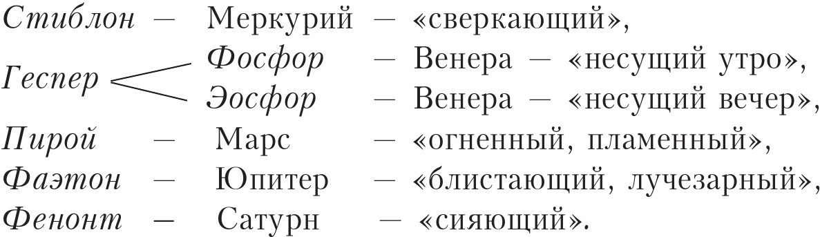 Значительно позже им были присвоены мифологические имена, как бы расшифровывающие их качества на понятийном уровне человека. «Хозяевами» планет стали персонажи пантеонов, антропоморфные качества которых соответствовали ощущаемой или видимой характеристике планет. Например, быстрый Стиблон стал «звездой Гермеса», крылатого посланника богов; сияющая, искрящаяся Геспер – прекрасной Афродитой. Таким образом, свойства планет как источников энергии получили символические, но фантомные определения качеств, отличающие их друг от друга. В 1709 г. в знаменитом Брюсовом календаре писали: «Звездоблюстители, или астрологи, имена седми движимым звездам, еже есть планетам, от качества их действ нарицания им прорекоша».