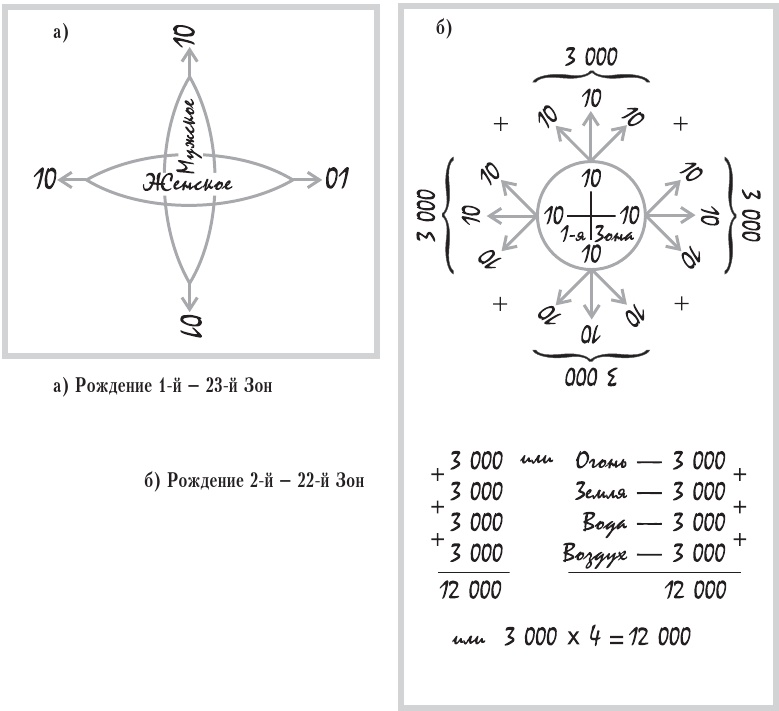 Следует отметить также тот факт, что количественная, числовая характеристика тоже фантомна, то есть подчиняется закону формообразования, хотя он и являет собой как бы ирреальную силу в тонких пространствах. Однако при последующей расшифровке, обретая более плотные, воспринимаемые формы, она (числовая характеристика) подпадает под действие закономерностей, свойственных принятым системам исчисления, – то есть слагается из единиц. Этим объяснением я хочу предварить часто возникающий вопрос – почему у Царей Зон определенное количество детей (будущее человечество). Не вдаваясь в подробные объяснения, нарисую схему оккультного (фантомного) увеличения количества от 1-й Зоны ко 2-й. Надеюсь, она достаточно понятна для вдумчивого читателя (рис. 5).