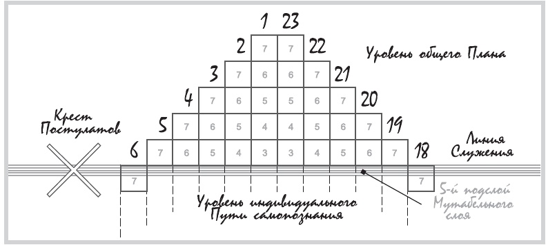 Представим себе человека, начавшего свое монадическое индивидуализированное существование в Стихийно-статическом слое. До пятого подслоя Мутабельного слоя он «дошел» по общим законам, не уклоняясь от правил набора материала, являя собой шаровидный вихрь. Перейдя границу расположения Креста Постулатов, он приобретает все соответствующие качества: становится свободным в своей воле, самодостаточным (двунаправленным) и неординарным (имеющим собственную личностную окраску). Для примера рассмотрим дитя 4-й Зоны. Полем его познания должен быть 6-й подслой Мутабельного слоя Земли. На этом поприще своей деятельности отпрыск Хевы должен был бы пройти определенную петлю (в соответствии с I Постулатом), не прерывая ее, от точки начала «А» до точки конца на том же уровне «Я», то есть весь набор положенных точек (весь алфавит своего намеченного пути). Как гласит русская пословица, – «Сказав «А», говори и «Б».