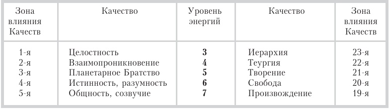 Выйдя на уровень этих энергий и «пройдя» соответствующие аспекты Качеств, можно сознательно стать полноправной единицей Закона с тем, чтобы в дальнейшем транслировать его «вниз».