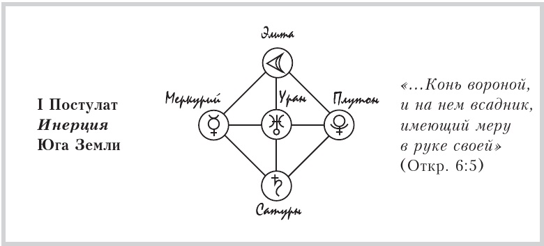 Поэтому в Апокалипсисе Иоанна описание «системы» коня вороного со всадником дополняется специфической принадлежностью Юги Земли к Постулату Инерция: (символическое «воздаяние») «хиникс пшеницы за динарий, и три хиникса ячменя за динарий; елея же и вина не повреждай» (Откр. 6:6). Не будем разбирать подробно смысл этих символов, который сводится, без сомнения, к законам причинно-следственных связей и непосредственно к человеческой карме.