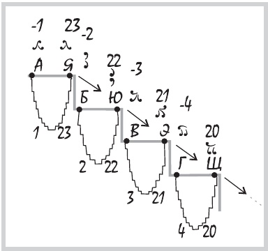 На этом рисунке путь на каждом уровне ступенек обозначен в двух системах алфавита. Русский алфавит показывает только числовую характеристику точек пути: первой (1) и последней (23), соответственно месту буквы в алфавитном ряду. Эзотерический алфавит Алес (см. «Стучащему, да откроется!») кроме числового значения Качества дает его символическую характеристику. Обратите внимание, что два знака на одном уровне (начало и конец) являются как бы зеркальными отражениями друг друга, но не полными, а лишь частичными, поскольку в конце Пути познанное Качество остается тем же, но с приращением Познания, то есть со знаком плюс.