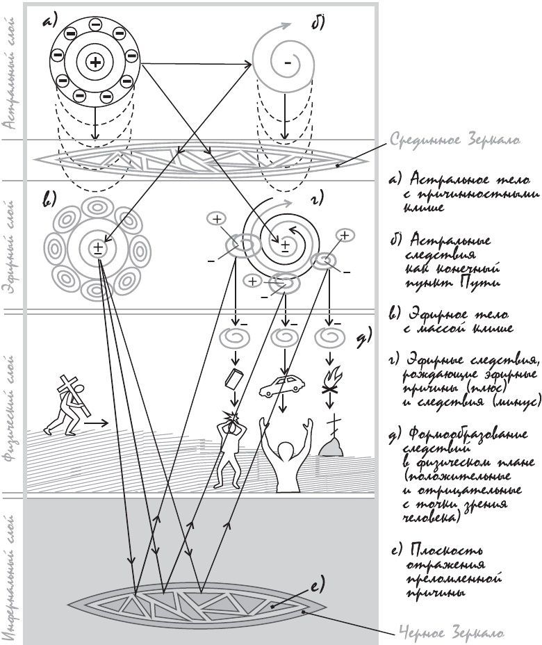 Следует добавить, что причина, материализованная в клише, становится частью тела человека, и он как бы срастается со своими мыслеформами этого порядка, не желая и даже боясь сбросить их как нечто кровно ему присущее. Следствия же Астрального и Эфирного слоев, являясь отраженными миражеподобными образованиями, не имеют внутри себя живой сущности. Они могут бесследно исчезнуть, растворившись в пространстве, но породившая их причина вновь создаст новое следствие. Следствие, скоагулированное в Эфирном слое, не обязательно должно отразиться в Физическом: оно может распасться еще до того, как под воздействием Черного Зеркала оформится в события на физическом плане. Дело в том, что основная причина образует следствие в Эфирном слое не напрямую, а опосредованно. Эфирным следствием становится ее голограмма. Потоки образующих ее лучей выносятся Черными фантомами. Проходя сквозь призму преломления соответствующей грани Зеркала, голографическое отражение причин проецируется в форму следствия. Этот же интерферирующий поток способствует увеличению массы причин и следствий и их перемещению в низкоэнергетические слои. В этом случае формами «падения» человека могут быть не только несчастья в Физическом слое, но и «наказание» в Инфернальных Зонах (демонический бред, «чертики» белой горячки и другие виды безумия).