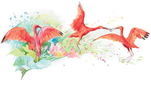 Снова стали появляться травоядные, правда на большом расстоянии. Берега Большой реки кишели пернатыми. Черноголовые ибисы выделялись своим белоснежным оперением на тёмном фоне речных заводей. Длинноногие марабу смешно приплясывали на зелёных островках. Бакланы внезапно кидались в воду и ныряли. В густых камышах прятались выводки нырков. Стайки журавлей с шумом проносились над скопищами белоголовых воронов. Попугаи, скрытые среди пальмовых листьев, пронзительно кричали…