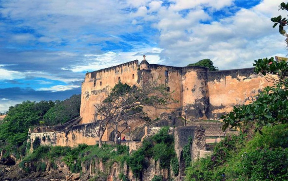 Темная и мрачная старая португальская крепость расположена на краю воды и охраняет вход в гавань Момбасы.