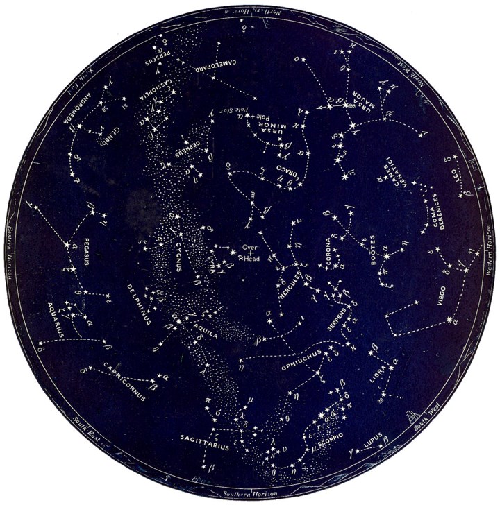 Due south, and high up, is the Eagle (Aquila), its tail at ζ and ε, its head at θ, the bright steel-blue Altair marking its body. On the left, or east, of the Eagle lies the neat little Dolphin (Delphinus). Midway between the Dolphin and the horizon is the tip of the tail of the Sea Goat (Capricornus), whose head lies nearly due south.
