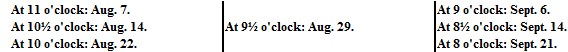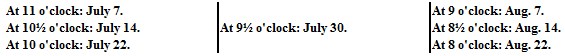 The Great Bear (Ursa Major) is low down, between northwest and north, the Pointers (α and β) directed slantingly upward toward the Pole. A line from the Pole Star (α of the Little Bear, Ursa Minor) to the Guardians of the Pole (β and γ), is in the position of the minute hand of a clock 12 minutes before an hour. Between the Great Bear and the Little Bear run the stars of the Dragon (Draco), round the Little Bear toward the north, thence toward the northwest, where we see the head of the Dragon high up, its two bright eyes, β and γ, directed toward Hercules, which occupies the western mid-heaven. Above Hercules is Lyra, the Lyre, with the bright steel-blue star Vega high up toward the point overhead. Right overhead is the Swan (Cygnus).