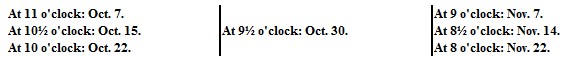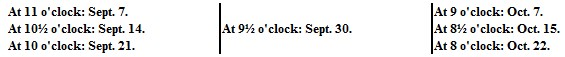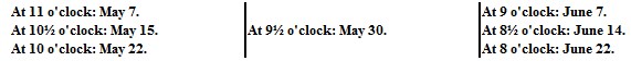 The Great Bear (Ursa Major) occupies all the upper sky from the west to north, except a small space occupied by the Hunting Dogs (Canes Venatici). The Pointers are in the northwest, almost horizontal. A line from the Pole Star (α of the Little Bear—Ursa Minor) to the Guardians of the Pole (β and γ) now occupies the position of the minute hand of a clock 3 minutes past an hour.