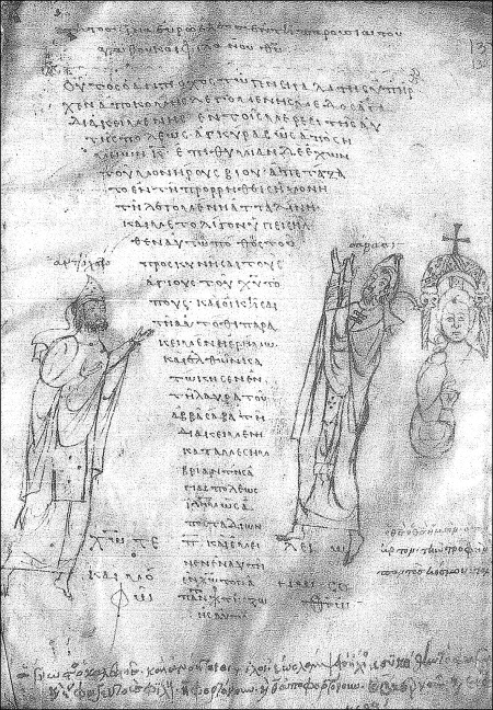 Антиох, Евстафий – игумен Атталинского монастыря и преп. Савва Освященный. Манускрипт St. Sabbas, 76 (X в.)
