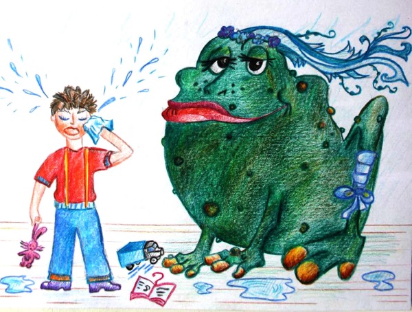 После этих слов зарыдал и Мальчик. Да оно и понятно: не каждый день тебе предлагается в невесты зелёное бородавчатое создание. Некоторое время они плакали вместе, а когда Лягушке мокрое дело надоело, она стала жениха успокаивать: