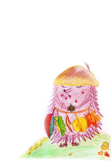 А на пеньке столько шляпок нашла, жёлто-коричневых с белыми оборками! Вот эти все взяла! Надела на голову, на каждую свою иголочку! У клёна, рябины, дуба взяла по листочку, нарядилась в пёструю блузку, да ещё подвеску повесила – сосновую шишку. Вышла на полянку, залитую солнечным светом. Посмотрела по сторонам: деревья окружили полянку стеной, шелестят позолоченными юбками! Стала Ежиха перед лужей: «Ну как, идёт?» Прислушалась. А Воробей ей в ответ с берёзовой ветки: