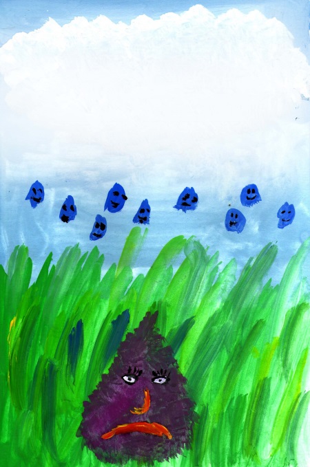 Загрустила клякса… Она лежала на земле, смотрела в небо и вспоминала то время, когда была маленькой весёлой капелькой. Как вместе со своими сестрицами – такими же маленькими и весёлыми капельками – резвилась в небесном просторе, прыгая с облачка на облачко, а яркое солнышко отражалось в её голубых глазах…