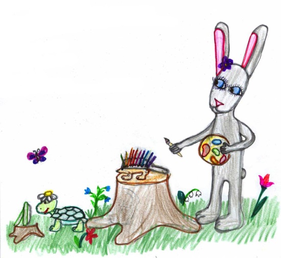 Заяц сидел на пеньке и любовался своей работой: