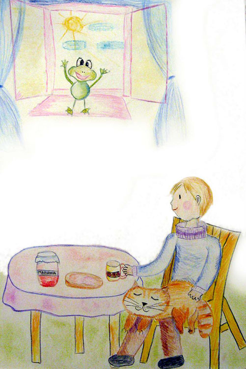Маленький лягушонок Квантик помахал коту лапкой и прыгнул на подоконник. Оттуда на ветку дерева, еще на одну, и был таков. У него началась новая лягушачья жизнь, в которой не было хищной Цапли, а на местном болоте его ждали новые квакающие друзья.