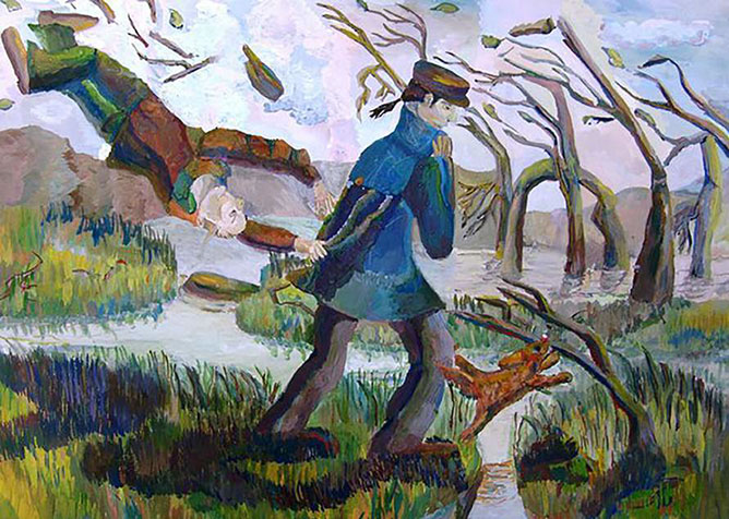 ВетерокОднажды над Городом пронёсся Ураган. Страшный, мощный, с огромной бородой, он ворвался в Город неожиданно, как разбойник, завывая, всё круша на своём пути, переворачивая скамейки в парке и телефонные будки, срывая крыши с киосков и вывески с магазинов, ломая деревья. Все жители сразу попрятались в свои дома, в Городе стало пусто. Покружив по опустевшим улицам и полюбовавшись учинённым разбоем, Ураган умчался дальше и не заметил, как из его всклокоченной бороды выскользнул один маленький вихрь и спрятался в кроне уцелевшего Тополя.