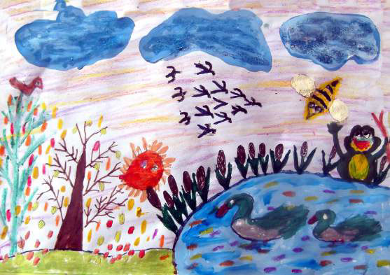 Осень. Вечер. Холодает.Вьётся пёстрая листва.А Лягушка рассуждает:«Сколько будет КВАжды-КВА?Разнеслись по лесу вестиОт учёного Крота –Это триста или двести,Но никак не меньше ста».Отвечает Утка строго:«Цифры я учу не зря:КВАжды-КВА – совсем немного,Больше будет КРЯжды-КРЯ!»Но Пчела вступает гордо:«В первый класс уже хожу.КРЯжды-КРЯ – я знаю твёрдо –Это меньше ЖУжды-ЖУ!»Козлик важно шёл по лугу,Сено скашивал к зиме.«Я, Пчела, скажу, как другу –Всё же больше – МЕжды-МЕ!»А Коровка не согласна:«Что за споры, не пойму!Неужели вам не ясно –Много – это МУжды-МУ!»Но Барашек блеет смело:«Возразить хочу тебе!Как, Бурёнка, ты посмела,Позабыть про БЕжды-БЕ!»Не сдаётся Поросёнок:«Без обмана говорю –Знаю я уже с пелёнок:Больше будет ХРЮжды ХРЮ!»Речь Кукушка затеваетНа осиновом суку:«Жаль, никто из вас не знает,Сколько тысяч в КУжды-КУ!»Ночь прошла в горячих спорах,Занимается заря.И разносится над бором:«ХРЮ! КВА-КВА! БЕ-БЕ! КРЯ-КРЯ!»Победила утром дружба:Больше будет (по уму) –КВАжды-КРЯжды-КУжды-ХРЮжды –БЕжды-ЖУжды-МЕжды-МУ!