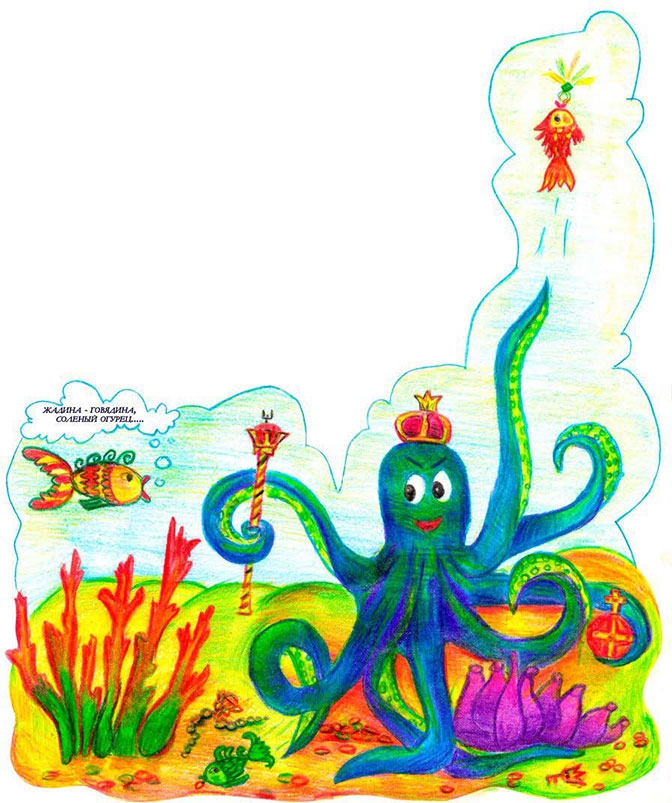 О скалы волнами разбитЛет сто тому назад,Пиратским золотом набит,Лежал на дне фрегат.Где волны бешено снуютСреди угрюмых скал,На глубине жил старый спрут,Богатства охранял.Он, говорят, был скуп и строг,Всё доверял ключам.Зачем он золото берёг –Не знал, пожалуй, сам.Лишь солнца ясные лучиДостигнут глубины,Как спрут тотчас берёт ключиУ краба со спиныИ, открывая сундуки –Все сундуки подряд,Он в восемь рук – не в две рукиСчитает древний клад.Но только вечных нет оков –В девятую волнуБогатство ржавых сундуковРассыпалось по дну.Напали рыбки в тот же мигНа жёлтую струюИ нахватали золотыхСебе на чешую.И что ни день – у рыбок бал,Но ловит рыбок спрутИ с той, которую поймал,Бывает очень крут.Он клад теперь не может скрыть,Но так решил в ночи:На всякий случай проглотитьОт сундуков ключи.