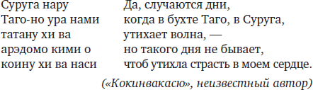 Для более позднего пласта вака периода императорских антологий начиная с Х века характерны более изощренные тропы, которые зачастую наслаиваются друг на друга, образуя некую «ребусную семантику», где в каждом слове или строке закодированы дополнительные образы. В принципе, почти все эти приемы были изобретены еще в эпоху «Манъёсю», но в поэзии VII–IX веков они встречаются редко, скорее в виде исключения. Со временем стремление к сложности и многозначности суггестивного образа становится доминирующим. У ведущих поэтов «Кокинсю» – Ки-но Цураюки, Исэ, Осикоти-но Мицунэ и других – многослойные полисемантические образы присутствуют в большинстве произведений, но первенство в области риторического изыска, вероятно, принадлежит блистательной Оно-но Комати, служившей идеалом и образцом для подражания многим поколениям стихотворцев. Каждое ее пятистишие – подлинный tour de force. На примере одного из шедевров Комати мы можем увидеть в действии, пожалуй, самый эффектный поэтический прием классической поэтики вака – какэкотоба («слово-стержень»), который охотно использовали многие поэты вплоть до XX века: