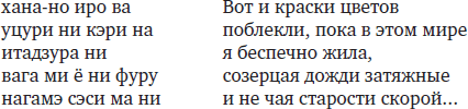 Какэкотоба – слово-стержень с двойным значением, создающее эффект омонимической метафоры. В приведенном пятистишии целых три какэкотоба, и каждое из них несет в себе дополнительные аллюзии. Так, иро означает «краски», «цвет», а в другом значении – «любовь», «чувство». Фуру означает «идти», «лить» – о дожде, а в другом значении – «стареть». Нагамэ означает «затяжные дожди», а в другом значении – «созерцать». Разумеется, передать в поэтическом переводе буквально все значения невозможно, да и в оригинале они выражены довольно смутно. Однако внимательный средневековый читатель, искушенный во всех тонкостях поэтического искусства, должен был уже при первом прочтении уловить весь аллюзивный подтекст.