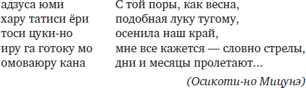 Здесь мы видим богатый спектр тропов. Адзуса юми («словно лук из древа катальпы») – это макуракотоба, относящаяся к хару («весне»); хару – какэкотоба, означающая одновременно «весна» и «натягивать» (лук); иру, что означает «стрелять из лука», служит энго к юми («луку»). Кроме того, здесь присутствует еще один чисто риторический прием – эмфатическая частица кана в конце стихотворения.