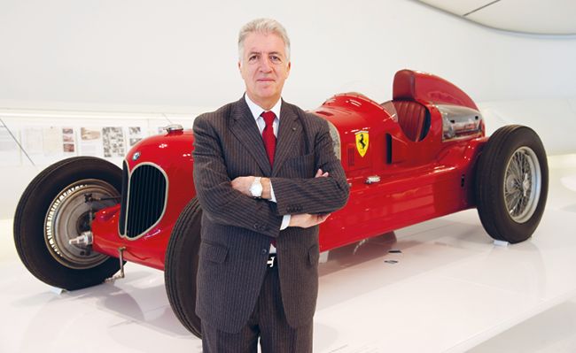 Пьеро Ларди Феррари, внебрачный сын Энцо, позирует на фоне Alfa Romeo 16C Bimotore, которую «Скудерия» создала в тщетной попытке победить немецкие Mercedes-Benz и Auto Union.