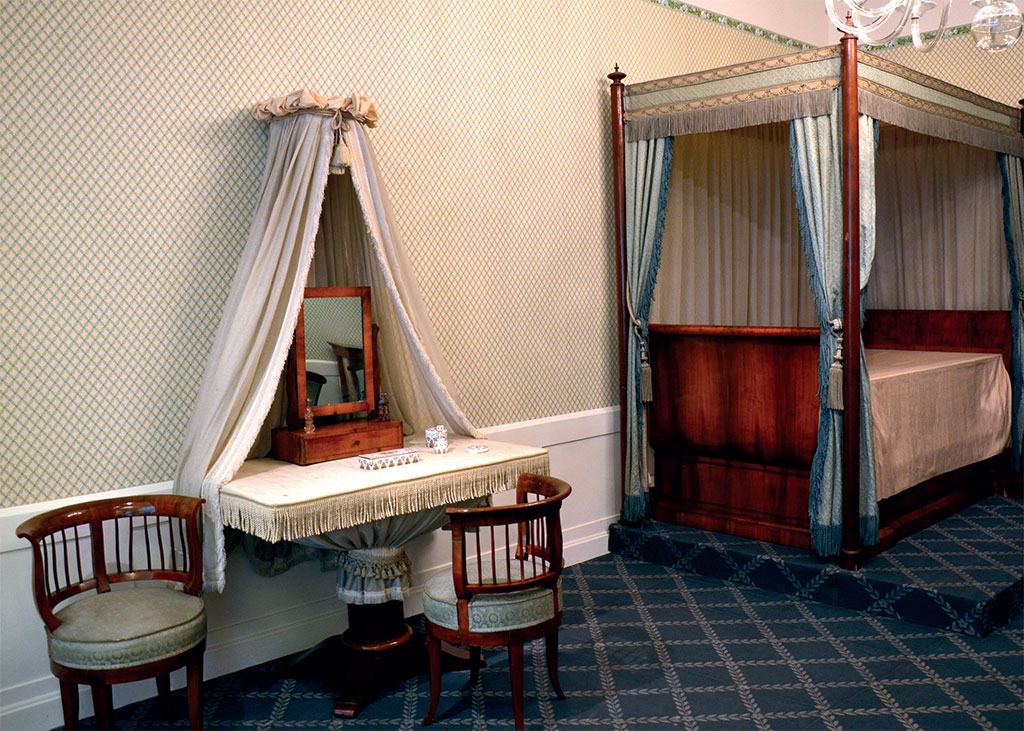 Недорогие ткани: полосатый репс и цветастый ситец вместо шикарной шелковой обивки.