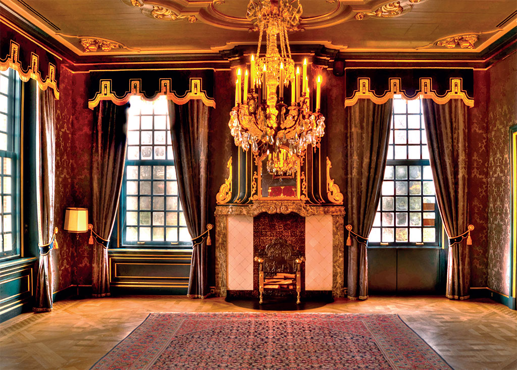 Фанеровка, позолота, черный лак, стекло, вышивка, обои, ковры, бахрома.