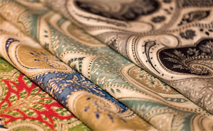 Ткани – преимущественно бархат, парча, дамаст, тафта, ситец, тонкий лен, шелк; в обивке – набивной бархат, твид, шерсть и шелк с цветочным рисунком. Кожа, гобелены, ковры с растительным рисунком.