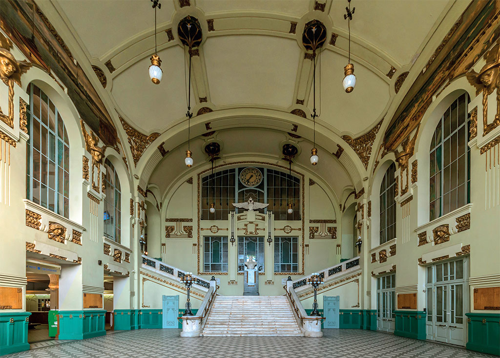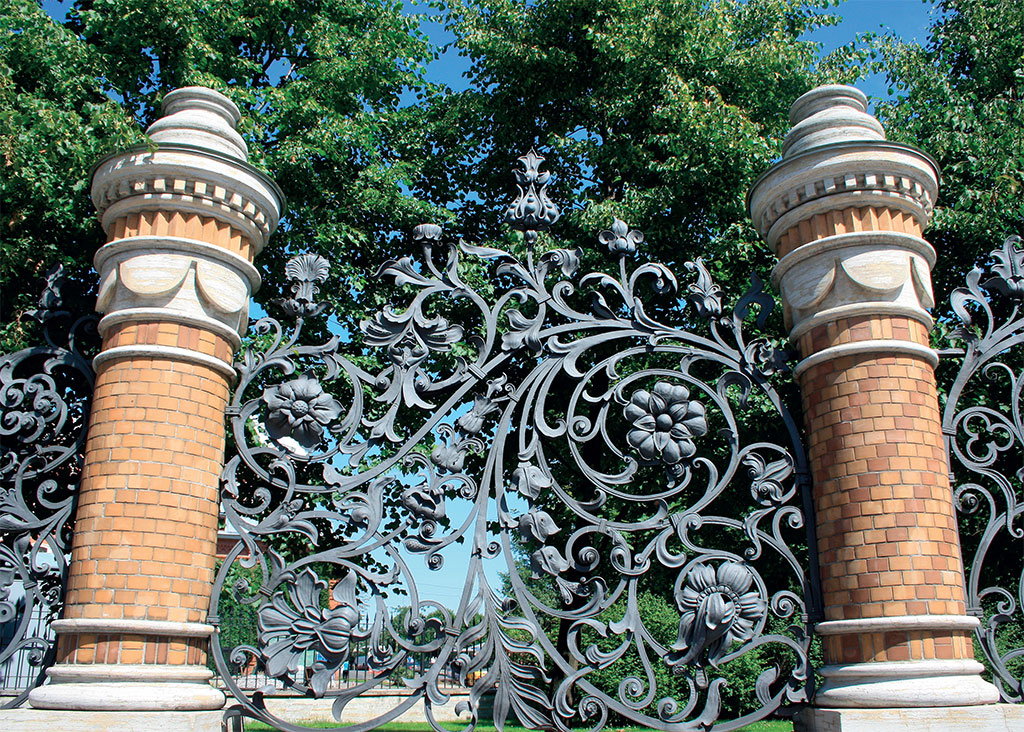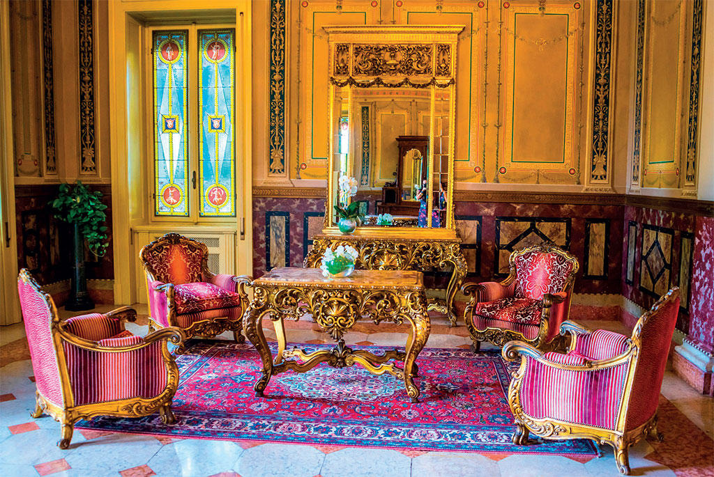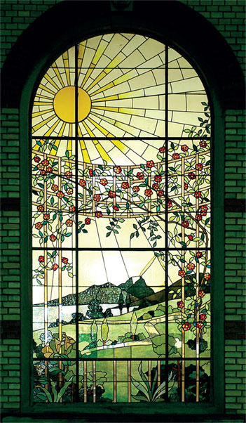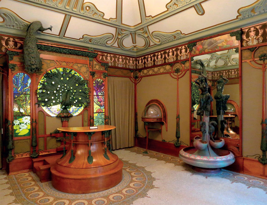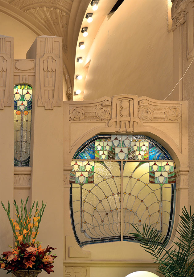 Витражи на окнах и дверях в стиле «Тиффани», изящные кованые перила и решетки, расписное стекло, мозаика, гобелены – копии картин; роспись стен и потолков, легкая лепнина, фризы.