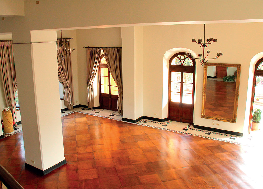 Отделка дорогая и качественная: темная древесина ценных пород (красное дерево, орех, мореный дуб, тис). Лепнина, витражи, паркет. Терракотовая или черная и белая плитка, уложенная в шахматном порядке в холле, кухне, санузлах.