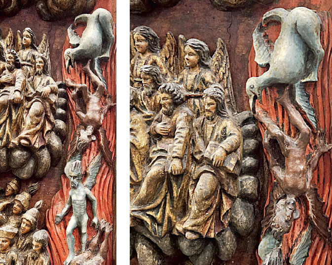 Страшный суд: слева от Христа, в правой части иконы, в струях огня падшие ангелы низвергаются с небес, превращаясь в бесов. В раскрытой пасти Ада сидит дьявол с Иудой на руках. У демонов голые тела, крылья и вздыбленные прически – обо всем этом мы поговорим в третьей главе. Но самый верхний бес выглядит как толстая белая птица. Правда, вместо хвоста у нее растет нога с человеческой ступней и вывернутым назад коленом.