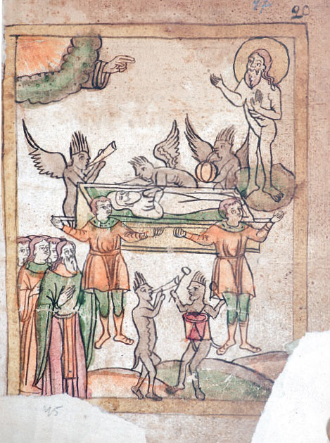 Похоронная процессия несет гроб на кладбище. Вокруг демоны играют на барабанах и трубах, радуясь о погибели богатого грешника. Их оркестр видит только святой Андрей Юродивый (он стоит справа вверху), а для прочих людей торжествующие музыканты остаются незримыми.