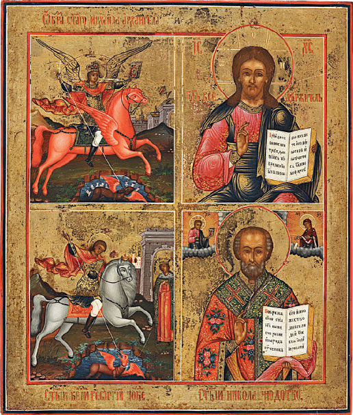 Икона четырехчастная: Чудо архангела Михаила, Христос Вседержитель, Чудо Георгия о змие, Николай Мирликийский, первая половина XIX в.