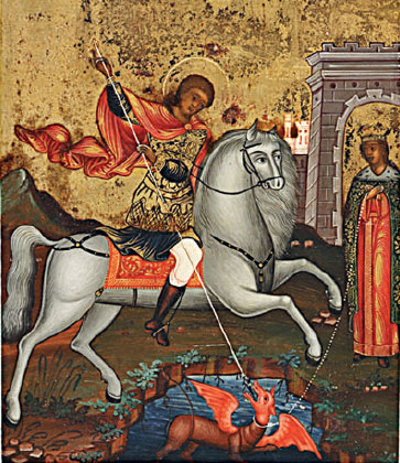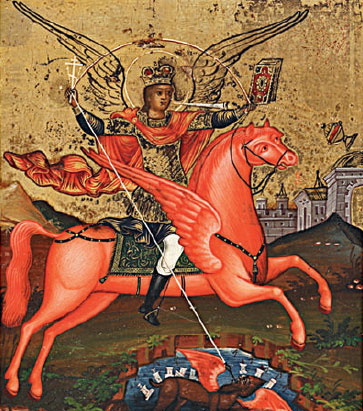Вверху архангел Михаил поражает копьем сатану (вокруг него, в озере, видны башни разрушенной крепости). Внизу Георгий Победоносец побеждает дракона, а рядом освобожденная принцесса уводит смирившегося змея в город на поводке. У дьявола и дракона общее положение и одинаковые красные крылья. Их родство визуально подчеркнуто.