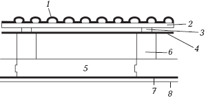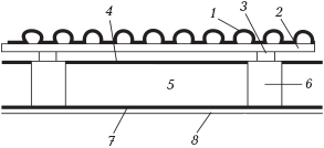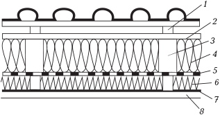 Рис. 68. Утепление крыши с укладкой теплоизоляции между стропилами: 1 – кровельное покрытие; 2 – обрешетка; 3 – брусок; 4 – ветро-, влагозащищенная мембрана; 5 – утеплитель; 6 – стропила; 7 – гидроизоляция; 8 – обрешетка