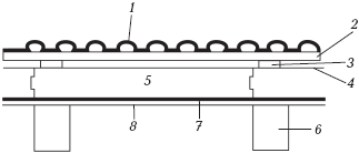 Рис. 70. Укладка теплоизоляции выше стропил с гидроизоляционным защитным слоем: 1 – кровельное покрытие; 2 – обрешетка; 3 – брусок; 4 – ветро-, влагозащищенная мембрана; 5 – утеплитель; 6 – стропила; 7 – гидроизоляция; 8 – обрешетка