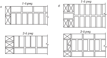 Рис. 29. Цепная кладка: а) кладка в полтора кирпича, б) кладка в два кирпича