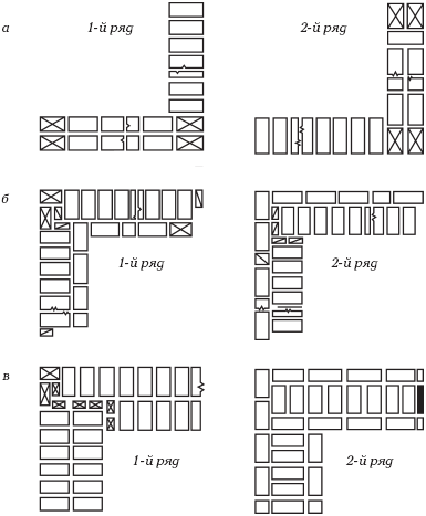 Рис. 30. Кладка прямых углов: а) стена толщиной в один кирпич, б) стена толщиной полтора кирпича, в) стена толщиной в два кирпича